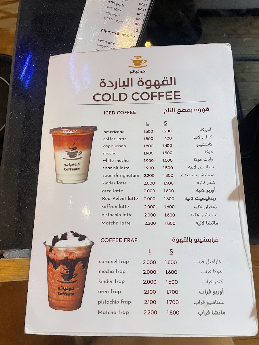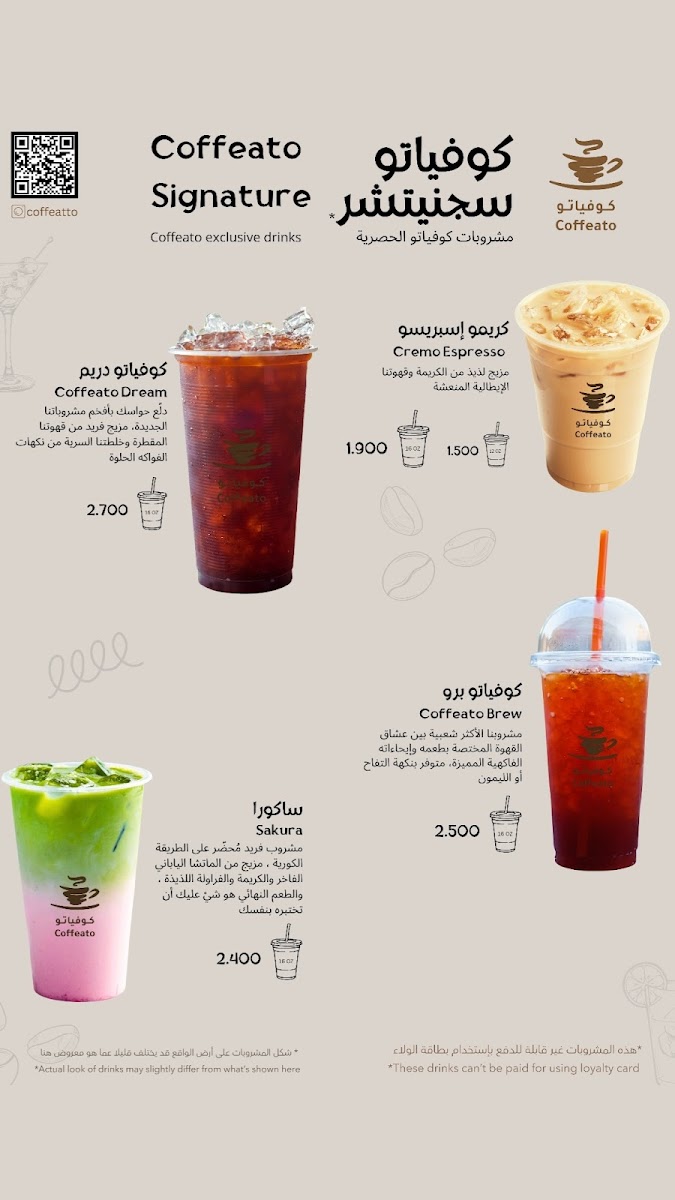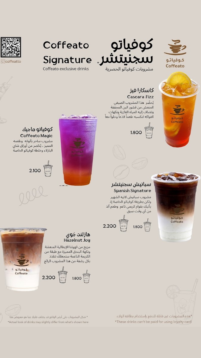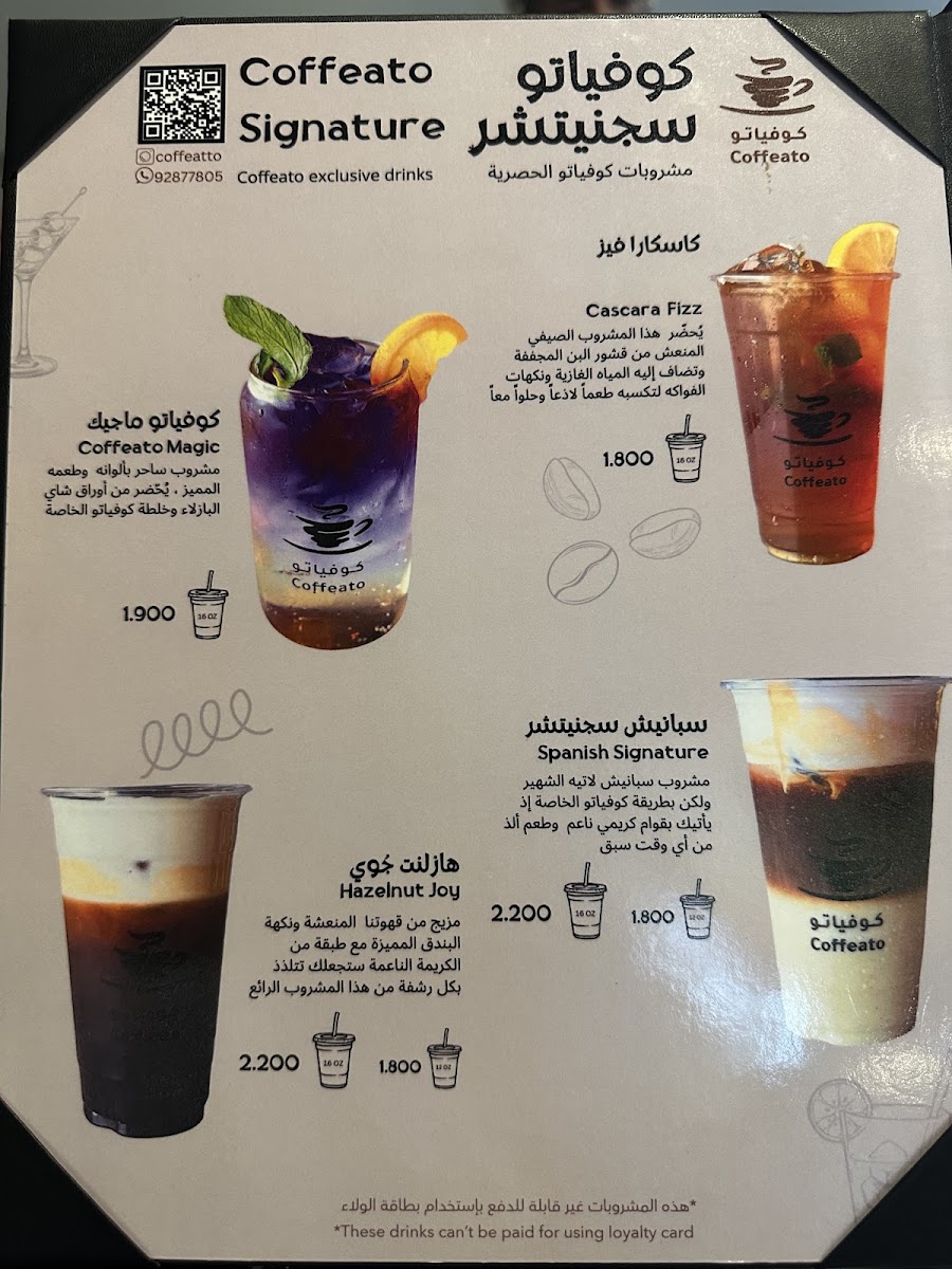 The menu showcases an array of beverages, including refreshing cold drinks that won over Mohammed Khamis, who highlighted the cafe’s ability to create a calm, enjoyable experience. Whether you're a traveler like Ahmed Farhat, who finds it superior to many offerings in Muscat, or someone seeking a perfect hangout spot with friends like Hassan Ziad, Coffeato Cafe ensures a 10/10 experience with excellent service. Plus, eco-conscious guests will appreciate the commitment to sustainability—no disposable cups here!